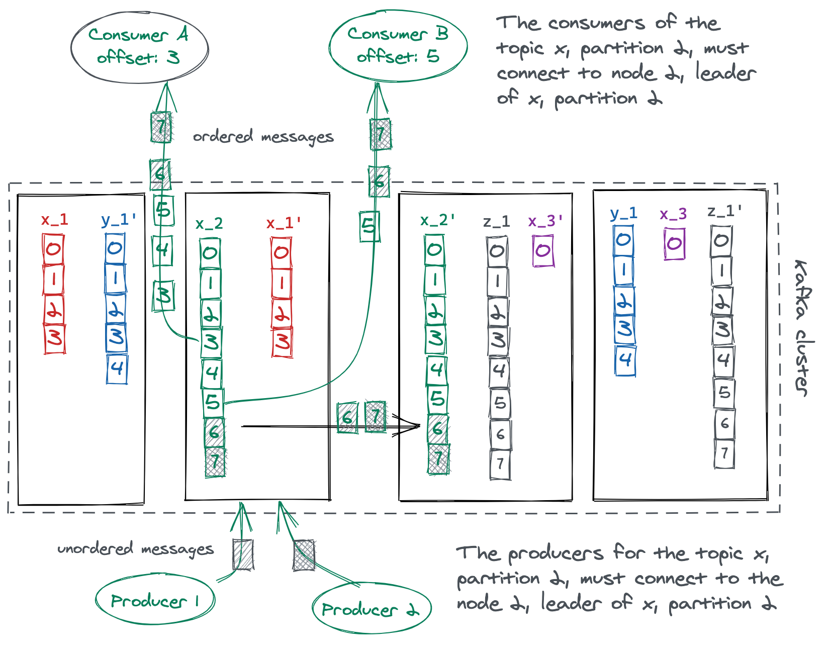 - Each topic partition has replicas on other nodes - among which exactly one is leader