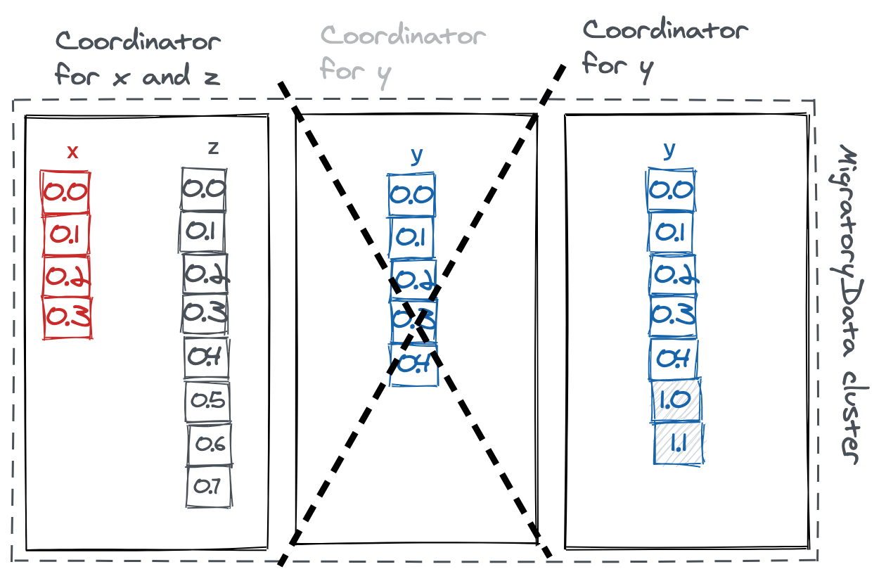 - If node 2 (coordinator of y) fails, another node is elected to coordinate y