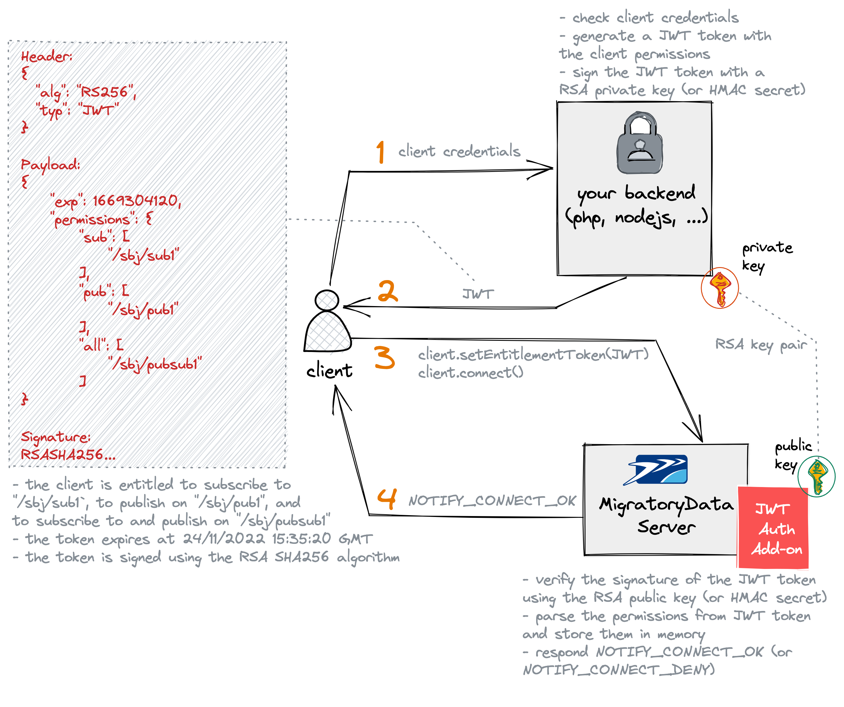The JWT Authorization add-on of the MigratoryData server verifies the signature of the JWT token either with an HMAC secret if the JWT token was signed using an HMAC algorithm, or with an RSA public key if the JWT token was signed using an RSA algorithm. If correct, it parses the permissions from the JWT token and store them in memory for subsequent publish and subscribe authorization requests. Finally, if both the signature verification and permission parsing are successful, then the add-on sends a notification