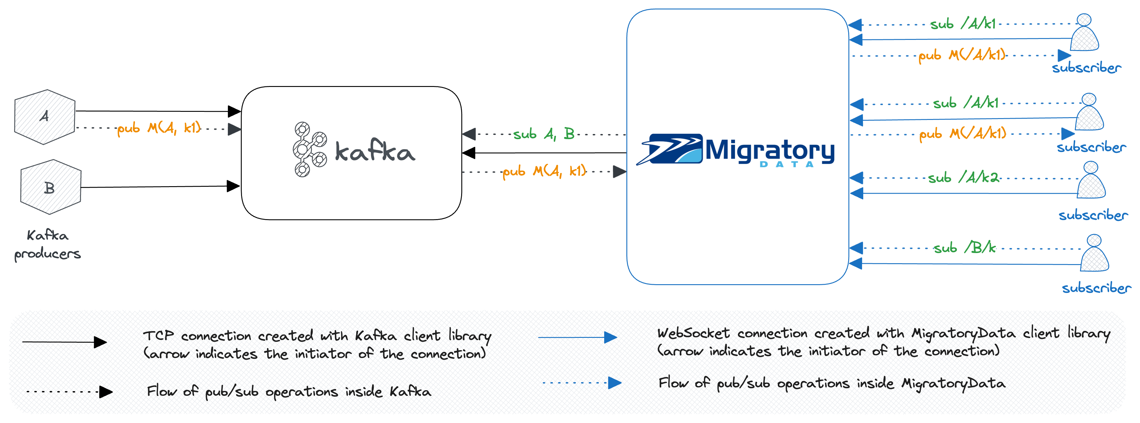 MigratoryData KE establishes a TCP connection to Kafka by utilizing Kafka’s client library and can be configured to subscribe to a configurable list of Kafka topics.